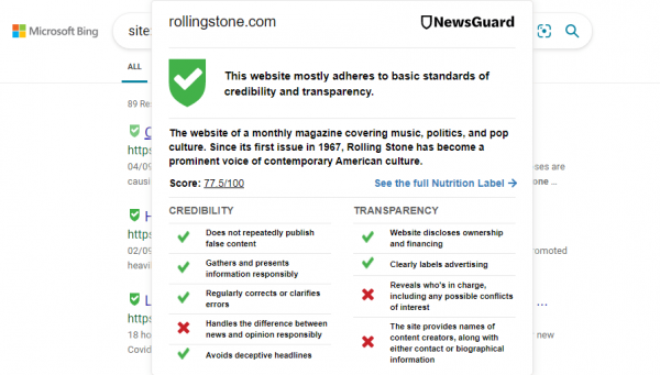 NewsGuard maintains a list of news outlets it considers “trustworthy” and “untrustworthy,” data which it uses in a browser extension that users can add on to various mainstream browsers, including Google Chrome and Microsoft Edge. When the extension is installed, it displays red warning labels alongside links to websites NewsGuard considers untrustworthy, and green labels next to links to websites it considers trustworthy.